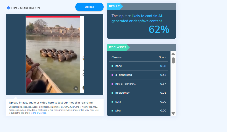 In the next step of the research , the video was analysed using another AI detection tool, HIVE Moderation. According to the results obtained, the video was found to be 62 per cent AI-generated.