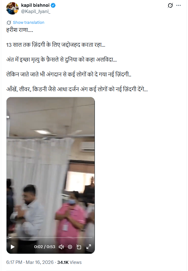 “Harish Rana… struggled for life for 13 years… in the end said goodbye to the world through euthanasia… but even while leaving, gave new life to many through organ donation… eyes, liver, kidneys and several other organs will give a new life to many…”
