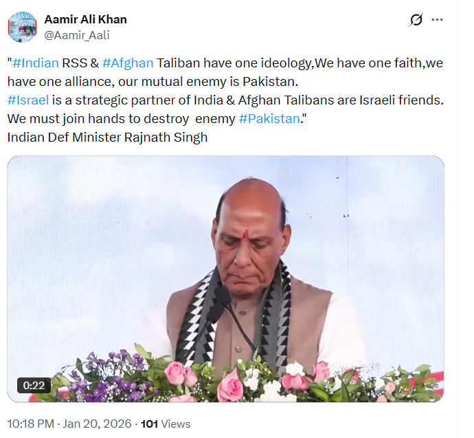 An X user, Aamir Ali Khan (@Aamir_Aali), on January 20 shared a video of Defence Minister Rajnath Singh, claiming that he drew parallels between the Rashtriya Swayamsevak Sangh (RSS) and the Afghan Taliban. The user alleged that Singh stated both organisations follow a similar ideology and belief system and therefore must “walk together.” The post further quoted Singh as allegedly saying: “Indian RSS & Afghan Taliban have one ideology, we have one faith, we have one alliance, our mutual enemy is Pakistan. Israel is a strategic partner of India & Afghan Taliban are Israeli friends. We must join hands to destroy the enemy Pakistan.” Here is the link and archive link to the post, along with a screenshot.
