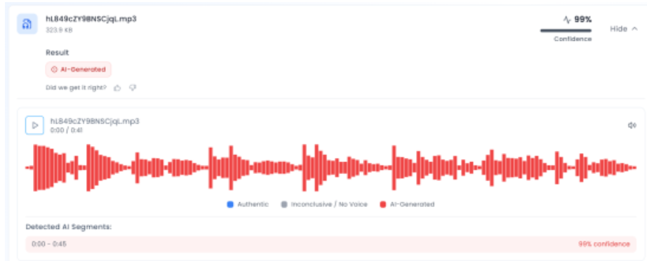 In the next stage of the research , the audio track from the viral video was extracted and analysed using the AI voice detection tool Aurigin. This confirmed that the original visuals were misused and overlaid with a synthetic voice track to create a misleading narrative.