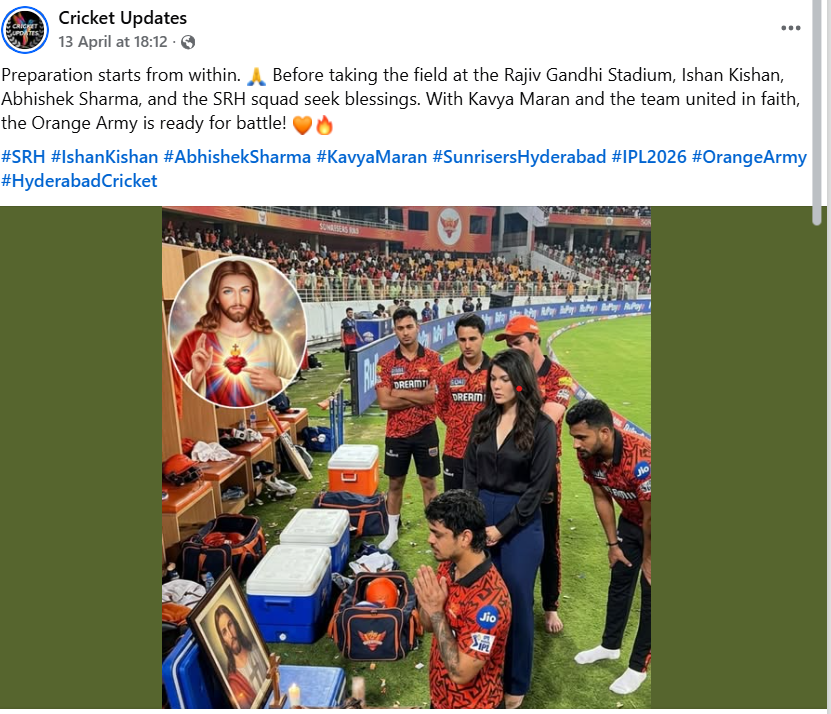 A Facebook user shared the image with the caption:“Preparation starts from within. Before taking the field at the Rajiv Gandhi Stadium, Ishan Kishan, Abhishek Sharma, and the SRH squad seek blessings. With Kavya Maran and the team united in faith, the Orange Army is ready for battle!”