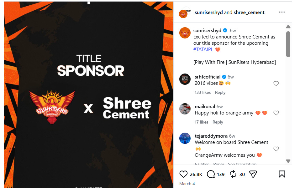 Additionally, the image incorrectly displays Dream11 as the title sponsor for SRH, whereas Shree Cement is the official title sponsor for the IPL 2026 season.