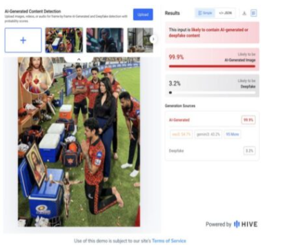 A post is rapidly going viral on social media claiming to show Sunrisers Hyderabad (SRH) captain Ishan Kishan, CEO Kavya Maran, and the team seeking blessings in front of a portrait of Jesus Christ at the Rajiv Gandhi International Cricket Stadium before a match. The image is being shared as a genuine pre-match moment. However, research by the CyberPeace found that the viral image is not real but generated using artificial intelligence (AI). There are no credible media reports or official updates from Sunrisers Hyderabad confirming any such pre-match activity. Further analysis using multiple AI detection tools also indicated that the image is likely synthetic. Therefore, the claim made in the viral post is false.