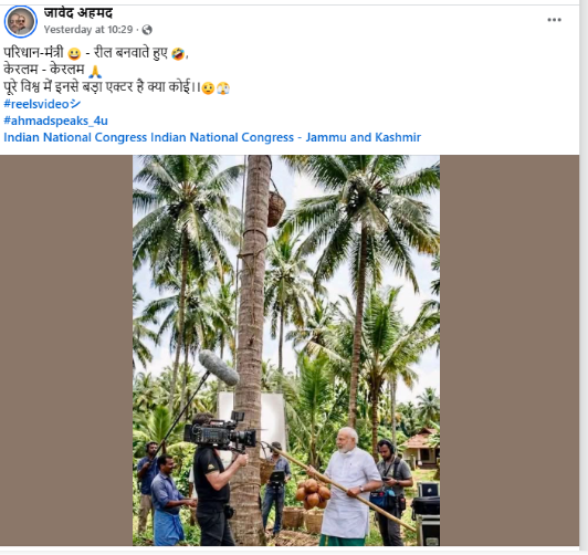 A Facebook user named “Javed Ahmad” shared the viral image on April 6, 2026, with a sarcastic caption suggesting that the Prime Minister was posing for reels during his Kerala visit.