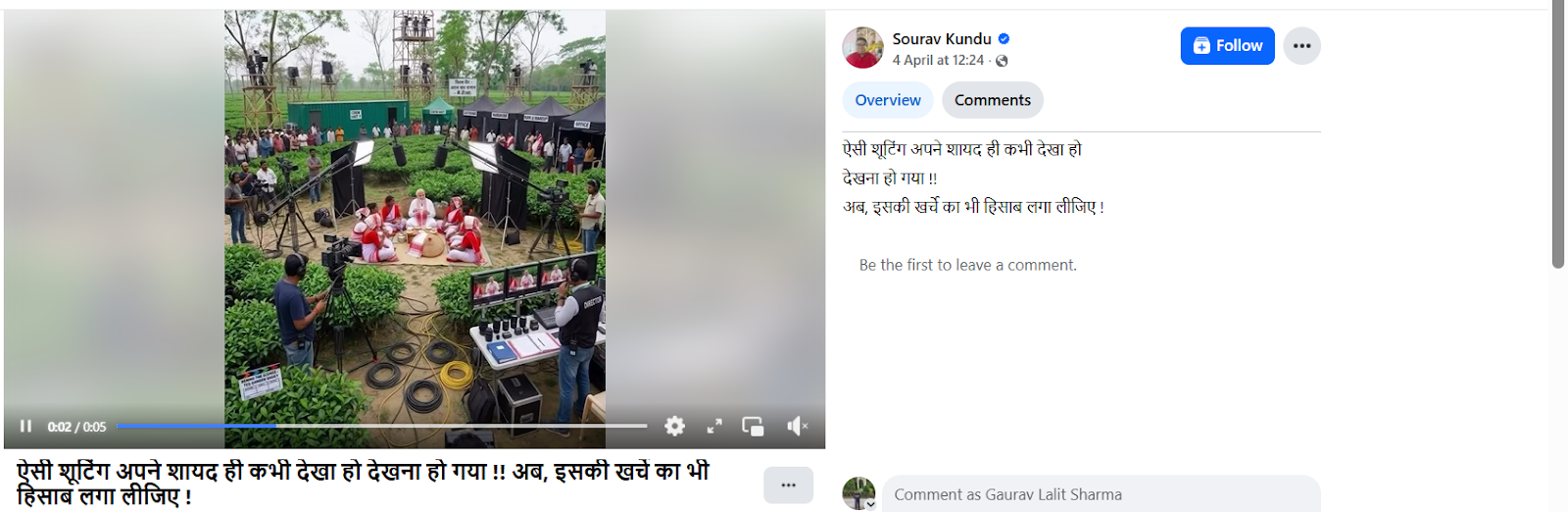An image of Prime Minister Narendra Modi is being widely circulated on social media. The picture is being shared with the claim that during an election campaign in Assam, a full-fledged shooting set was arranged in a tea garden where Modi interacted with women workers, complete with cameras, microphones, lights, and a director-led production team. However, research by the CyberPeace has found the claim to be false. Our research reveals that the viral image is AI-generated and is being shared with a misleading narrative.