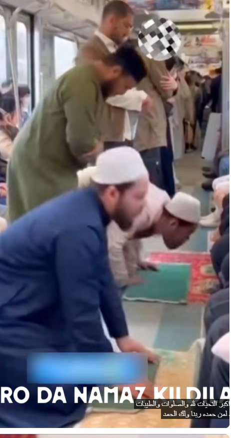 A user shared the viral video on YouTube, showing a group of men—mostly dressed in long tunics and skullcaps—appearing to offer prayers inside a moving subway train. Passengers can be seen seated on both sides of the carriage. In the clip, two men are kneeling on the floor and bowing their heads onto a small mat placed in front of them, with their heads coming very close to the knees of seated passengers. Another man is seen bending forward at the waist while standing, and a fourth appears to be standing upright with his eyes closed.