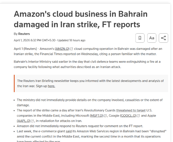 According to a report published by Reuters on April 1, 2026, Iran launched a missile attack targeting Amazon’s cloud computing operations in Bahrain. The Islamic Revolutionary Guard Corps (IRGC) had earlier warned that U.S.-linked companies in the Middle East—including Microsoft, Google, and Apple—could be targeted.