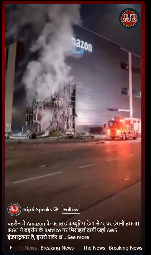 A Facebook user, “Tripti Speaks,” shared the viral video on April 2, 2026, with the caption:“Iranian attack on Amazon’s cloud computing data center in Bahrain. IRGC fired missiles at Batelco in Bahrain where AWS infrastructure is located, damaging servers and disrupting services.”