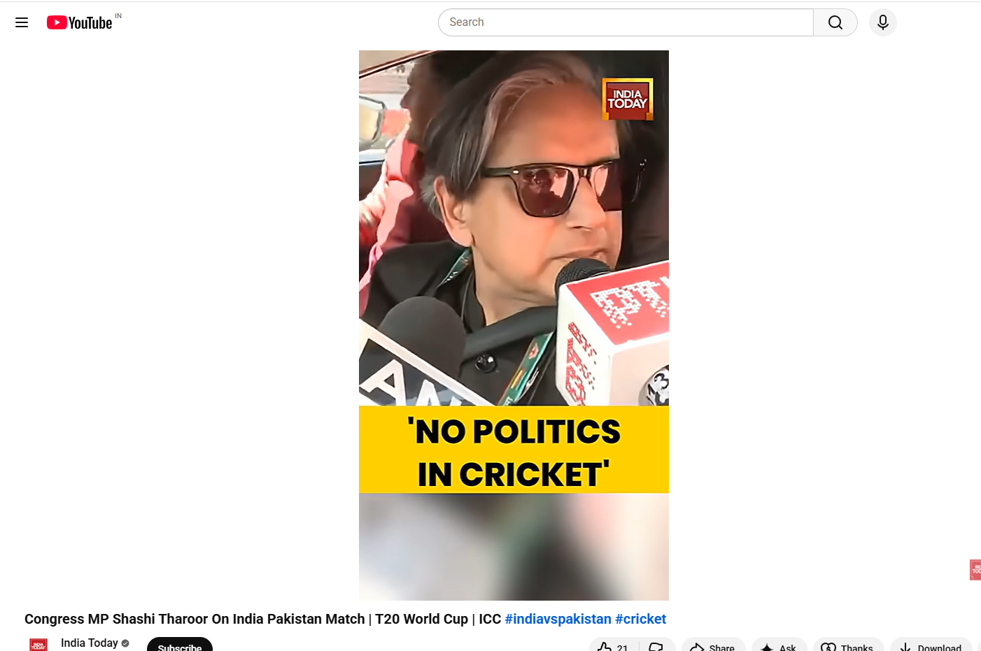 A reverse image search using Google Lens led the Desk to a video uploaded on February 10, 2026, by India Today on its official YouTube channel. The visuals in this original video exactly matched those seen in the viral clip showing Tharoor speaking to the media. However, upon analysing the original footage, we found that Tharoor was speaking in Hindi about the controversy surrounding the T20 World Cup. He stated that politics should not be mixed with cricket or sports and did not praise Pakistan or the Pakistan Cricket Board at any point. This indicates that the audio in the viral clip had been manipulated and replaced. In the original video, Tharoor said that politicians should conduct politics separately, diplomats should handle diplomacy, and cricket players should focus on the game, expressing hope that cricket would move forward with the match.