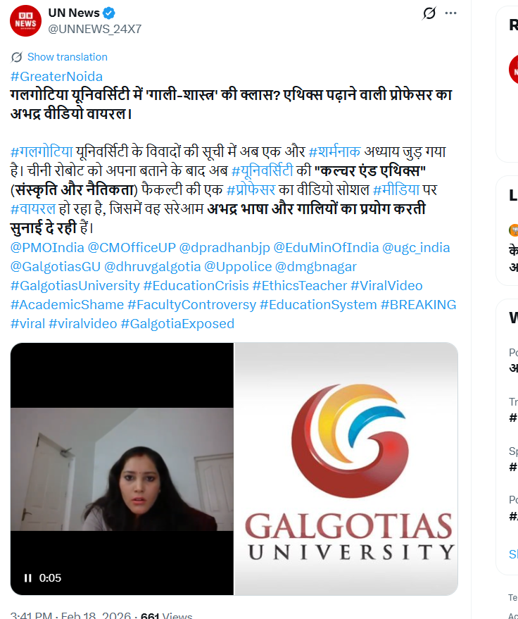 A user on X (formerly Twitter) shared the viral video on February 18, 2026, claiming: “A ‘class in abuse studies’ at Galgotias University? An obscene video of a professor teaching ethics has gone viral. Another shameful chapter has been added to the list of controversies surrounding Galgotias University.” The post further alleged that after falsely claiming a Chinese robot as its own, the university’s “Culture and Ethics” faculty member was seen publicly using abusive language in the viral clip. The post link and its archived version are provided below: