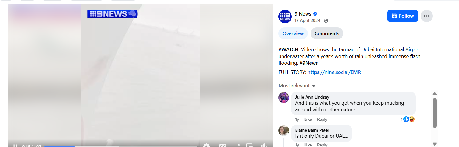 To verify the claim, keyframes from the viral video were extracted using the InVid tool and analyzed through reverse image search. One of the clips was traced to a Facebook post by “9 News,” uploaded on April 17, 2024. The video showed waterlogged runways at Dubai International Airport following intense rainfall and flooding.