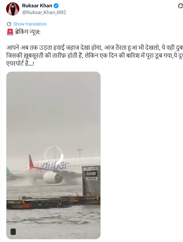 The misleading post was shared by an X (formerly Twitter) user named ‘Ruksar Khan’ on March 28, 2026, with a caption suggesting that Dubai had been submerged after just one day of rain. The post attempted to sensationalize the situation by portraying the visuals as current.