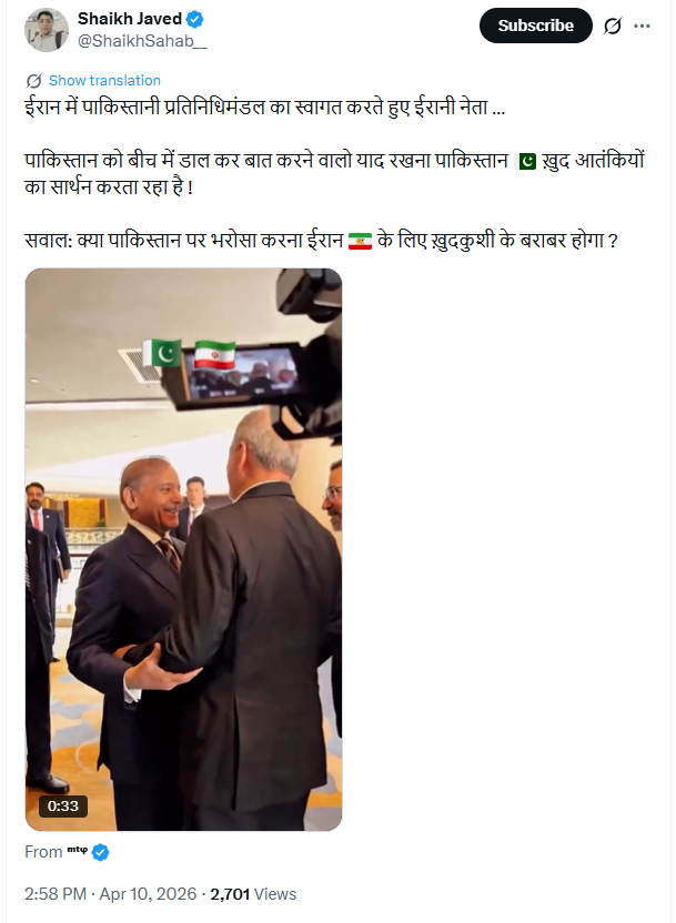 An X (formerly Twitter) user shared the video on April 10, 2026, claiming that it shows Pakistani leaders being warmly welcomed in Iran.