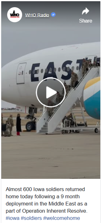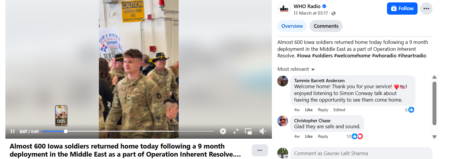 In its caption, the radio station stated that nearly 600 Iowa soldiers had returned home after a nine-month deployment in the Middle East as part of Operation Inherent Resolve. The segment, narrated by journalist Claire Burnett, explained that the soldiers belonged to the 2nd Brigade Combat Team, 34th Infantry Division, and had been deployed to Iraq and Syria. The footage was recorded at the 132nd Wing base of the Iowa Air National Guard in Des Moines.