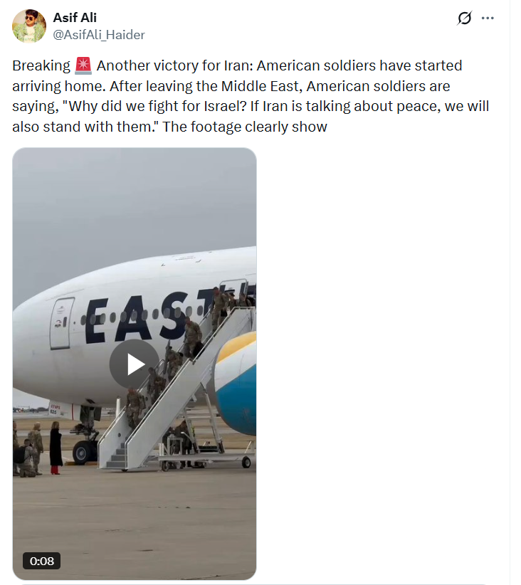 An X (formerly Twitter) user posted the video on April 7, 2026, claiming,“Another victory for Iran: American soldiers have started arriving home. After leaving the Middle East, American soldiers are saying, ‘Why did we fight for Israel? If Iran is talking about peace, we will also stand with them.’”