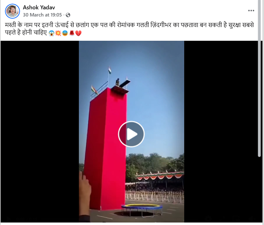 A video is being widely shared on social media showing a man in an army uniform jumping from a height, losing balance mid-air, and appearing to meet with an accident. The clip is being circulated as a real-life incident. However, a research by the CyberPeace found the claim to be false. The viral video is not real but AI-generated.