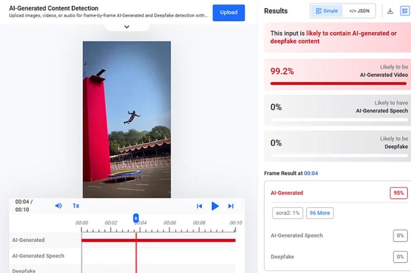 To verify the claim, we conducted a reverse image search using Google Lens but found no credible news reports or official sources mentioning such an incident. A closer look at the video revealed several inconsistencies commonly associated with AI-generated content. For instance, the person appears to disappear momentarily while falling, the head is not clearly visible after impact, and the background audio seems unnatural. We further analyzed the video using AI detection tools. On Hive Moderation, the video showed a 99.2% probability of being AI-generated.