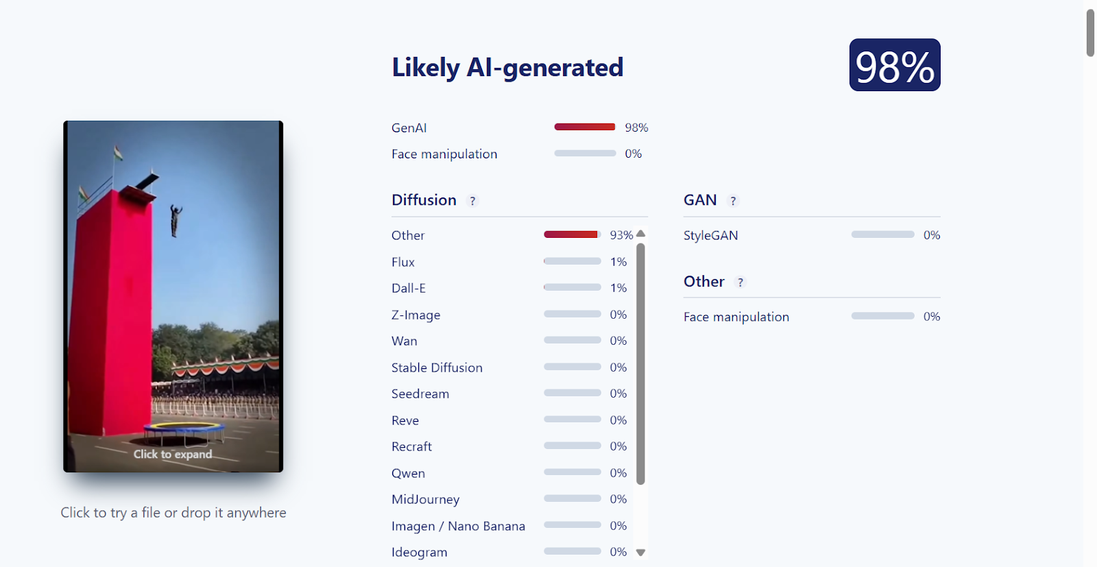 Additionally, analysis using Sightengine indicated a 98% likelihood that the video was synthetically created.