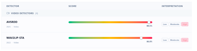 We also tested the video using the Deepfake-o-Meter platform.The AVSRDD (2025) model detected it as 99.5% AI-generated
