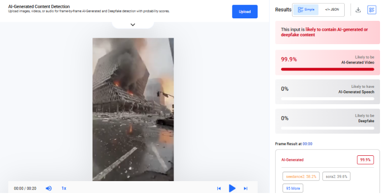 A closer examination of the video revealed multiple visual inconsistencies commonly associated with AI-generated content. For instance, a building on the left side appears to bend and collapse in a rubber-like manner—something that is physically unrealistic for structures made of concrete and steel. Additionally, the smoke and flames appear unnatural and lack realistic dynamics.