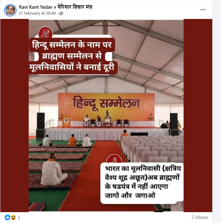 Users sharing the image claim that the event, held under the banner of a “Hindu Sammelan,” was in fact a “Brahmin Sammelan,” and that indigenous communities chose to stay away, resulting in poor attendance.