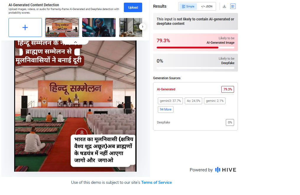 However, upon closely examining the viral image, we observed certain visual inconsistencies and unnatural elements that raised suspicion of AI generation. We first analyzed the image using the AI detection tool Hive Moderation, which indicated a 79.3 percent probability that the image was AI-generated.