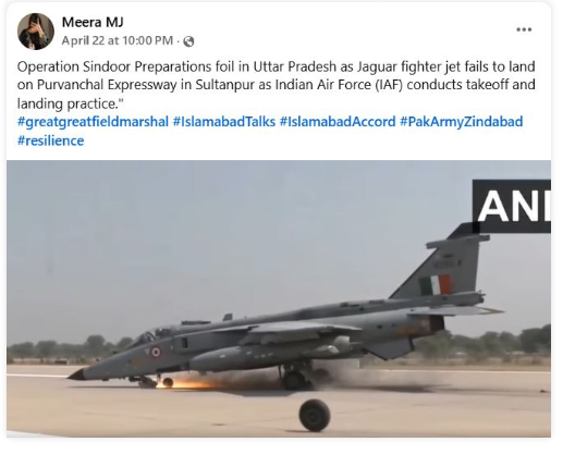 A video circulating on social media claims that a Jaguar fighter jet of the Indian Air Force (IAF) failed to land during a takeoff and landing exercise held on April 22, 2026, at the Purvanchal Expressway in Uttar Pradesh. The claim suggests that the incident disrupted preparations for “Operation Sindoor.” However, an research by the CyberPeace Research Wing has found the claim to be false.