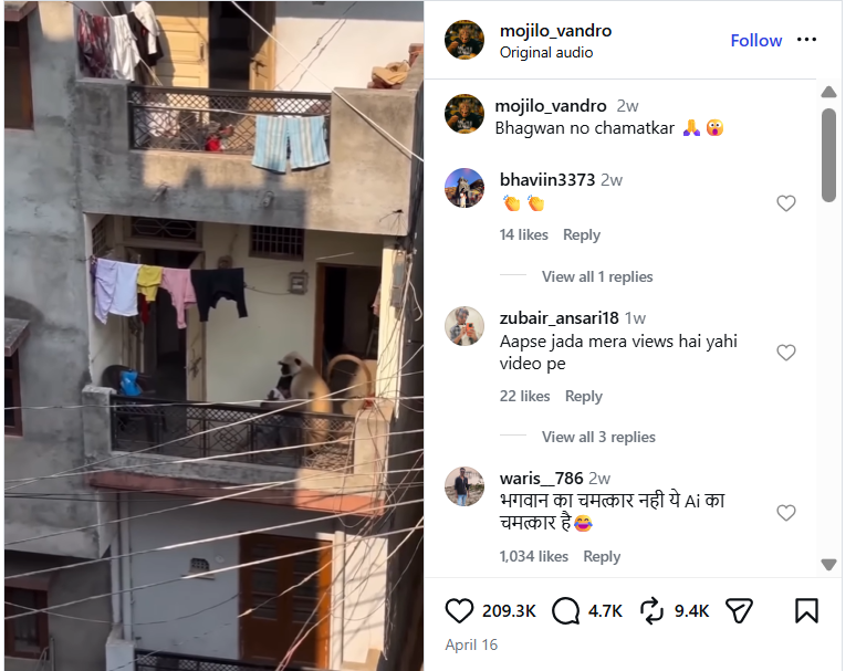 To verify the claim, we extracted keyframes from the viral video and conducted a reverse image search using Google Lens. During this process, we found the same video uploaded on April 16, 2026 by an Instagram account named Instagram user mojilo_vandro. The caption described the scene as a “miracle of God.”