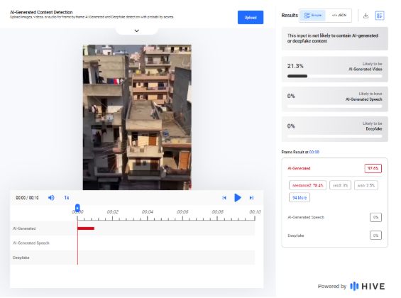 A closer review of the account revealed several similar monkey-themed videos. More importantly, the account bio clearly states that it creates AI-based fictional content. We also analyzed the clip using AI detection tool Hive Moderation, which assessed the video as having a 97.6% probability of being AI-generated