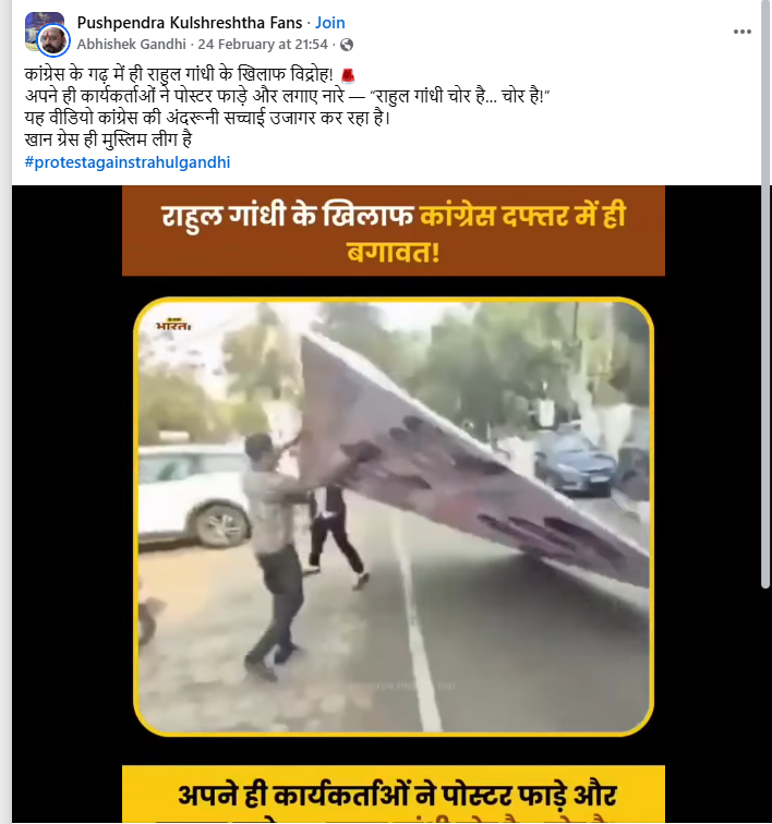 On February 24, 2026, a Facebook user shared the viral video with the caption:“Rebellion against Rahul Gandhi in Congress’ own stronghold! Party workers themselves tore posters and raised slogans — ‘Rahul Gandhi is a thief… a thief!’ This video exposes the internal truth of Congress. Congress itself is Muslim League.”