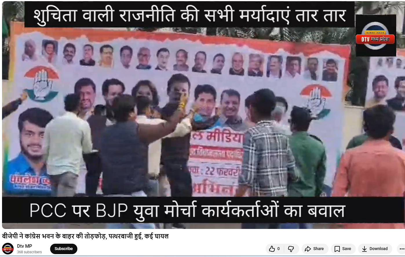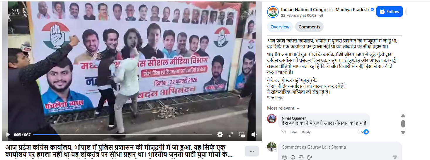 Further, we found the same viral video on the official Facebook page of Indian National Congress - Madhya Pradesh, where it was posted on February 26, 2026. In the post, the Congress unit alleged that BJYM workers and BJP-affiliated individuals had entered the Congress office, vandalized property, and created chaos in the presence of police officials.