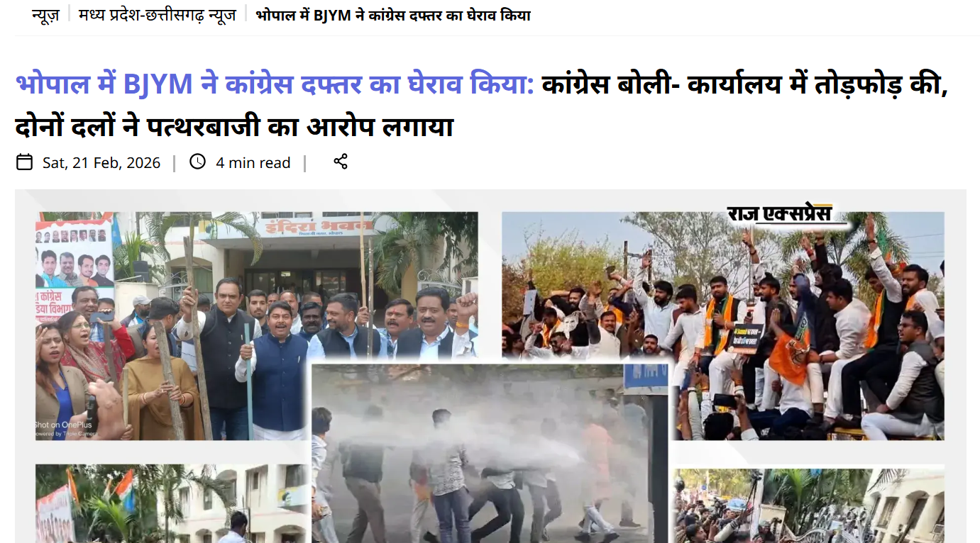 According to the report, the protest in Bhopal was organized by the Bharatiya Janata Yuva Morcha in response to a T-shirt protest staged by the Youth Congress during an AI Summit held at Bharat Mandapam in New Delhi. The situation escalated when protesters marched toward the state Congress office in Shivaji Nagar. Police attempted to disperse the crowd using water cannons, but some protesters reportedly entered the Congress office premises, leading to tension.