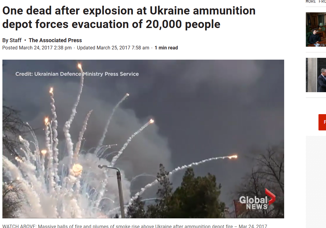 To verify the viral claim, we extracted keyframes from the video and conducted a reverse image search. During this process, we found the same video uploaded on March 23, 2017, on a YouTube channel named “null.” According to the upload, the video shows a massive explosion at an ammunition depot in Balakliya, Ukraine. Using these clues, we performed a keyword search and found a report published on March 24, 2017, by Global News.