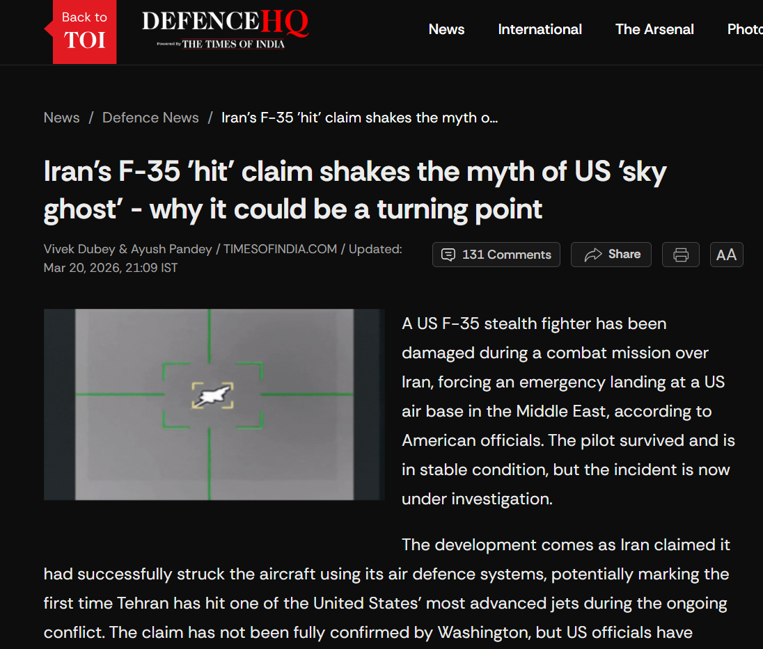 We began our research with a news search and found multiple reports stating that a US F-35 fighter jet was damaged during a combat mission over Iran. According to reports, Iran’s Islamic Revolutionary Guard Corps (IRGC) claimed to have damaged a US F-35 jet and also released a video. As per a CNN report, US officials confirmed that an American F-35 was damaged during a mission over Iran, forcing it to make an emergency landing at a US airbase in the Middle East. The pilot was safe and in stable condition, and the incident is currently under research .