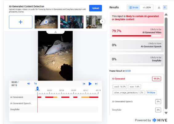 Upon closely examining the viral video, we noticed several inconsistencies indicating possible AI manipulation. We then analyzed the clip using Hive Moderation, which indicated nearly a 79 percent probability that the video is AI-generated. The analysis also suggests that it was likely created using Google’s AI video generation tools (Veo).