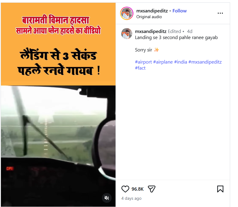 An Instagram user shared the viral video on January 29, 2026, claiming:“Baramati plane crash: video of the aircraft accident surfaces. Runway disappears just three seconds before landing.” (The link to the post, its archived version, and screenshots are provided below.)